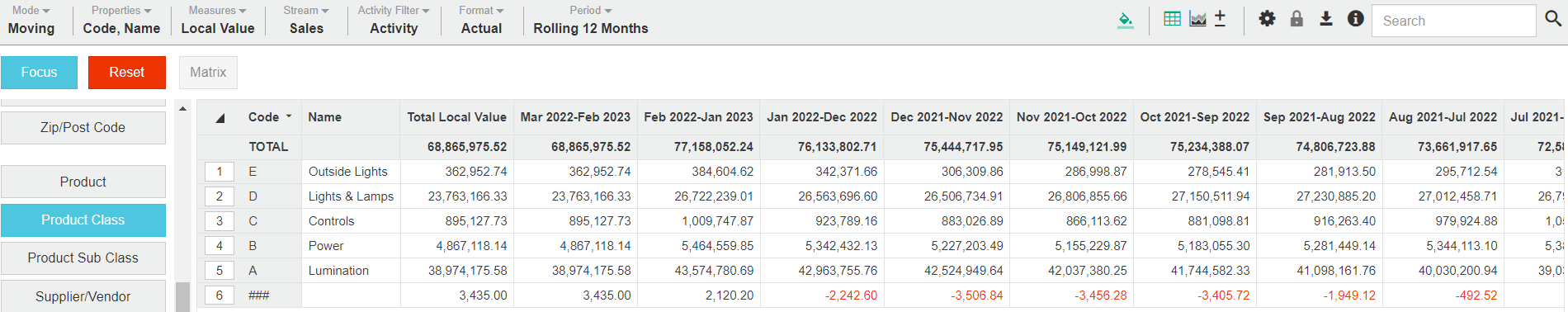 Moving mode is similar to Period mode, except that each month typically has the previous 11 months added to it, creating a moving, annual total view.