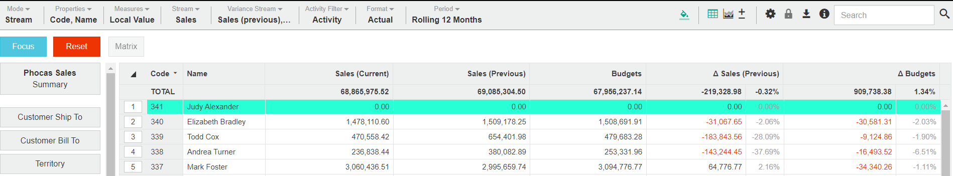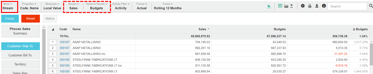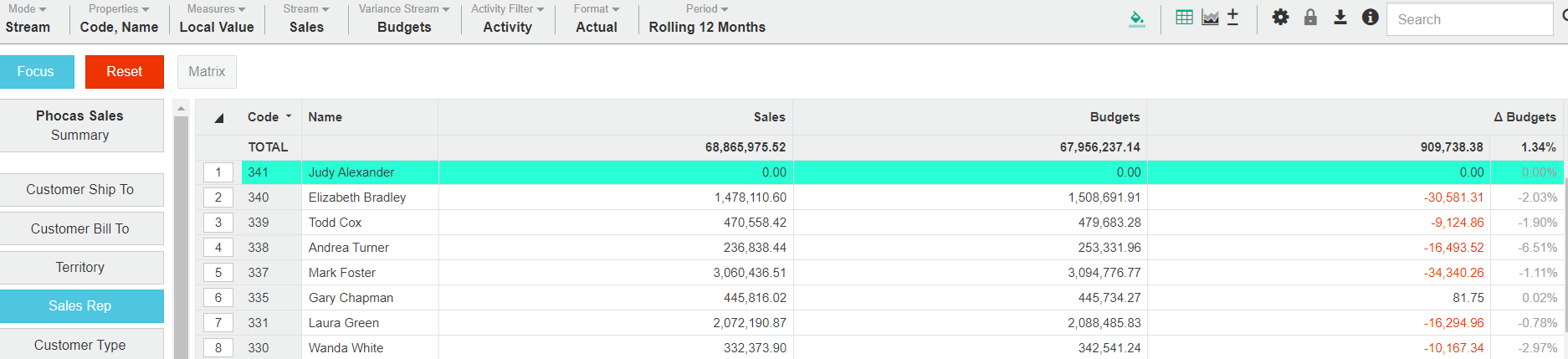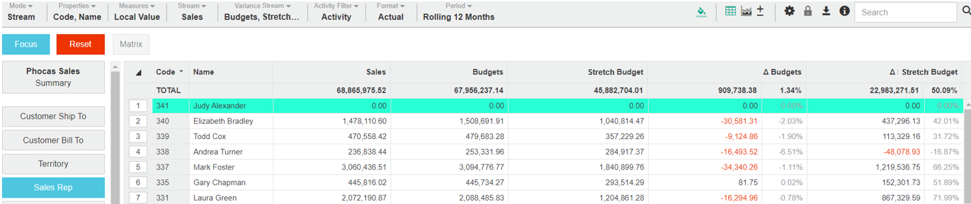 Click Variance Stream > Budget, then click out of the menu. The grid updates to display the Sales Rep data from the two streams, along with the variance between them (as an amount and percentage), for the selected period (in this case it's rolling 12 months).