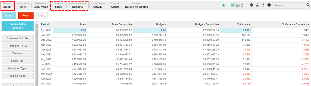 Stream mode allows you to compare multiple streams of data side-by-side, such as your sales vs. budget or sales vs. orders, which is useful for building KPI reports. In Stream mode, the Variance Stream menu becomes available on the right of the Stream menu and you use these two menus to control which streams display in the grid.