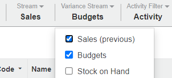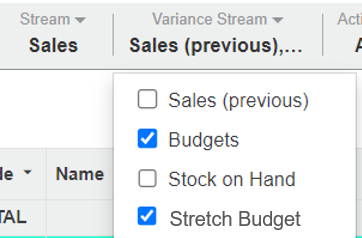 Use stream mode to compare a Sales Rep's performance against multiple streams: Following on from the example above, click Variance Stream > Stretch Budget (leave Budget selected) then click out of the menu.