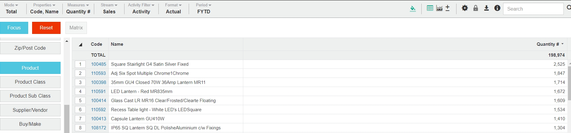 Click Period > FYTD. The grid updates to display the quantity sold of each product so far this year.
