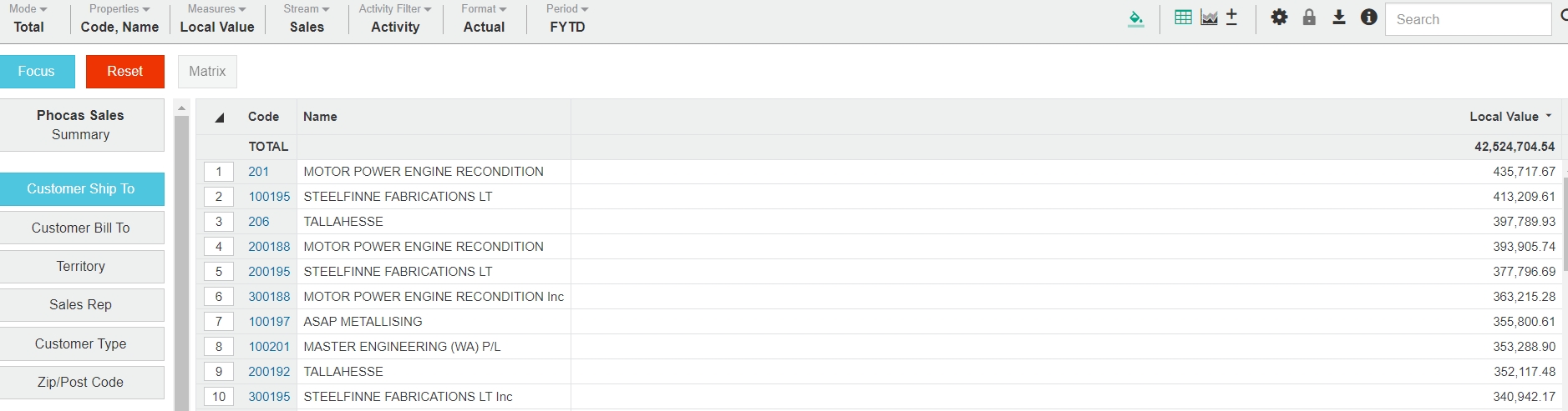 When you select a dimension, the grid displays columns for the active properties (such as Code and Name) for that dimension plus the Total column.