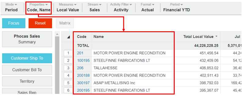 Properties are information stored about a dimension, displayed as columns in the grid when you select that dimension. By default, the Code and Name property columns display for all dimensions.