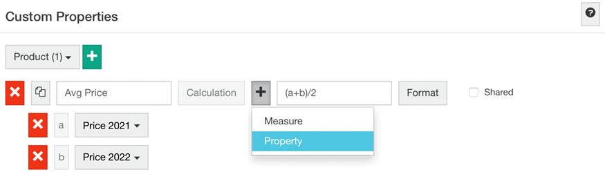 For example, suppose you have a ‘2021 price’ property and a ‘2022 price’ property for your Product dimension* but you want to get an average price across the two years. You can achieve this by creating a custom property (Avg Price) based on a calculation.