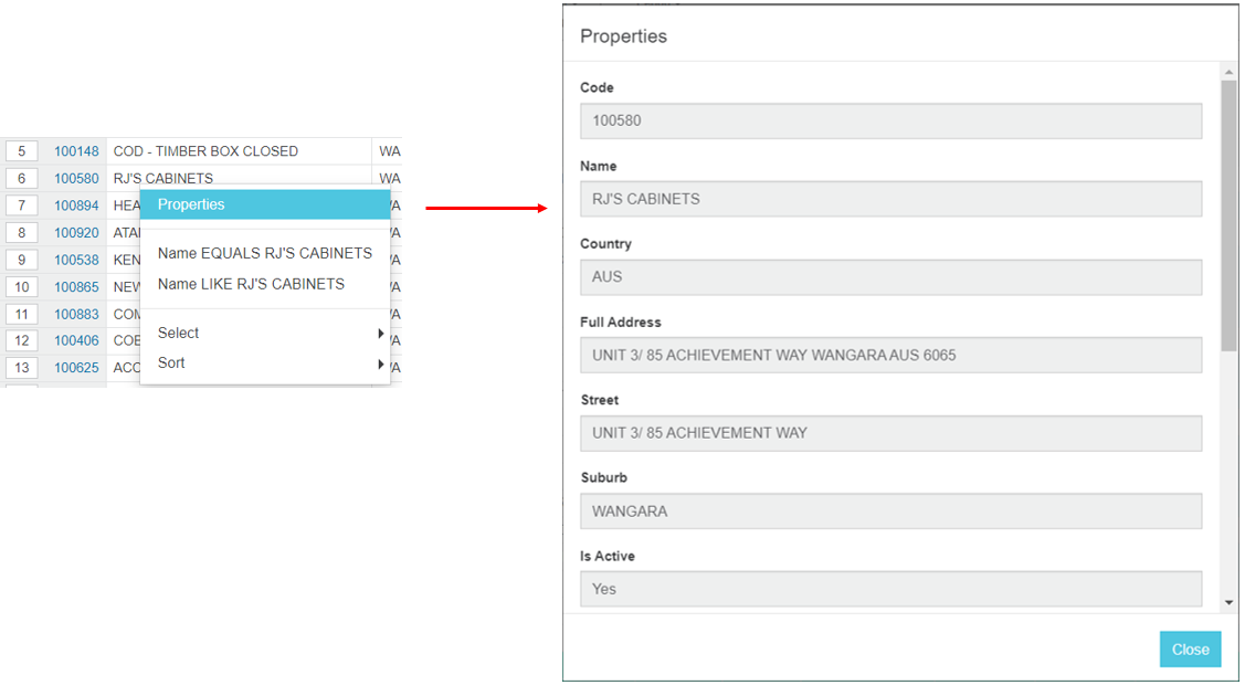 Right-click > Properties on any row (or long-tap on a device) to display a window containing all properties for that row, including those not displayed in the grid.
