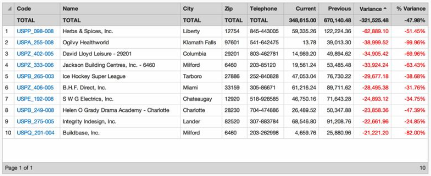 Suppose you want to identify the 10 customers who are declining the most in the year to date, and get some useful details (properties), such as their contact details.