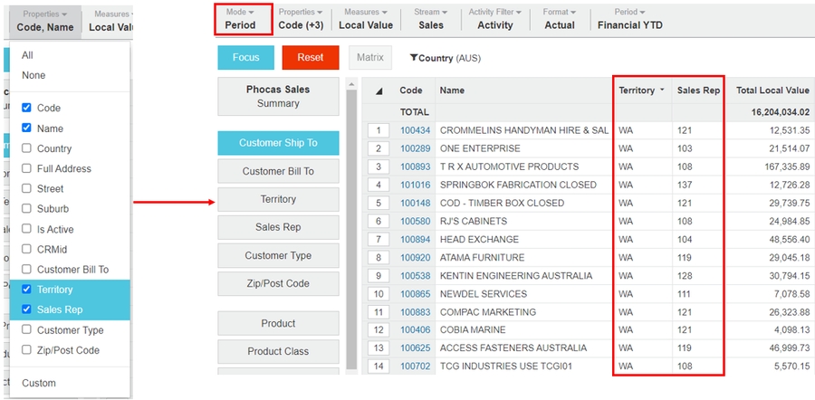 You can create a custom property based on properties and measures that are stored against dimensions in the database. Custom properties are useful, as they can be saved and applied to analyses that you conduct frequently. Once saved, the custom property displays in the Properties menu for the relevant dimension. When you select and apply a custom property, the grid automatically changes to Custom mode.