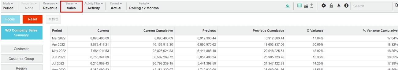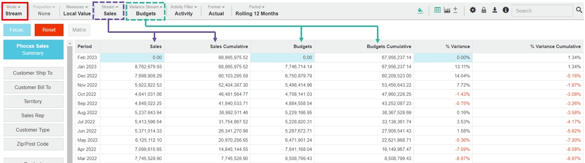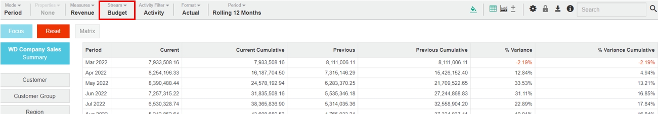 If a 'No results' message displays when you change the stream, this might be simply because the data does not exist. For example, budgets might not exist for individual customers or there might be no orders in the system for a particular branch.