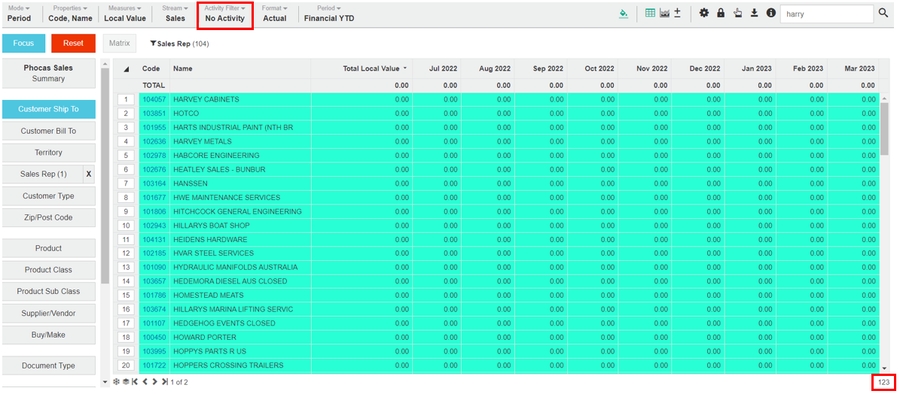 A simple way to identify customers who are not buying or products that are not selling is to use the activity filter. You can also change this filter to combine activity with no activity to identify opportunities.