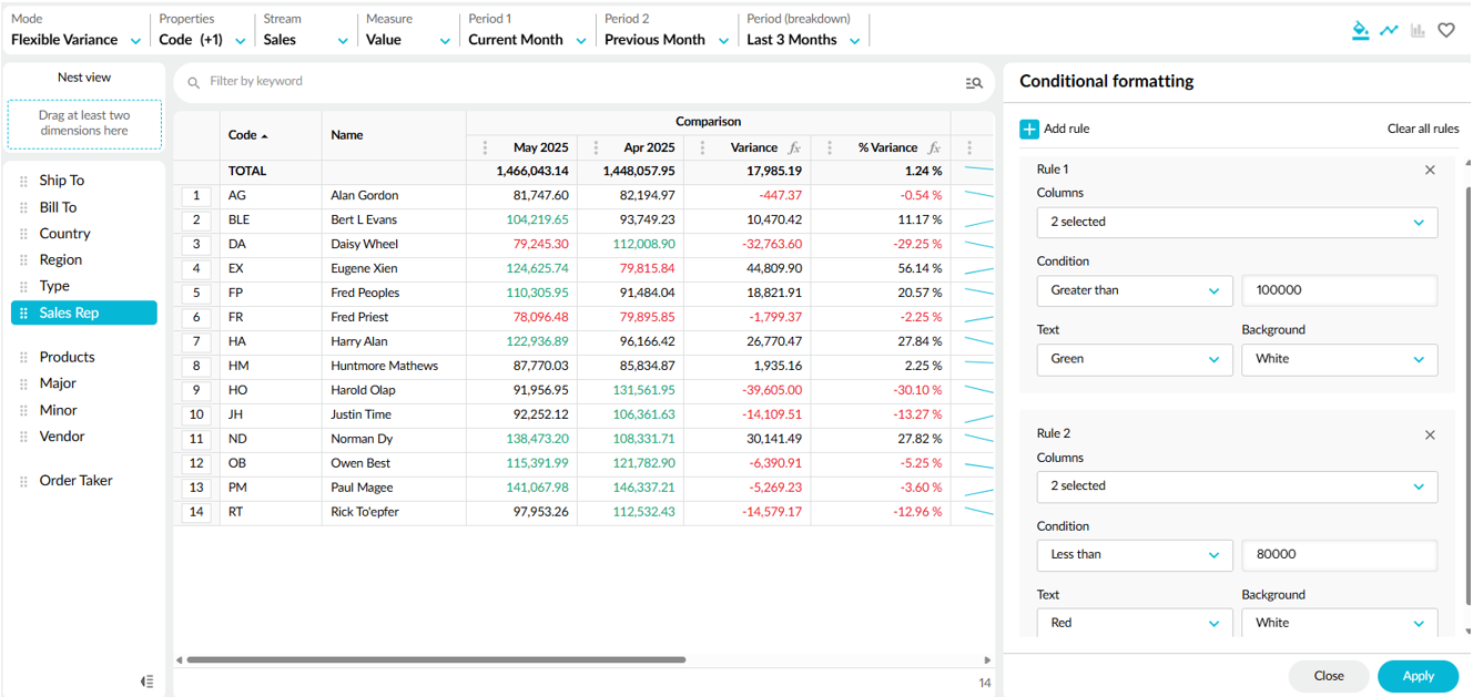 If you change your view of the grid, some formatting mightn't make sense. For example, if you apply rules to the Total column when the Sales Rep dimension is selected, then click the Product dimension, the formatting mightn't make sense as the total values are so different.