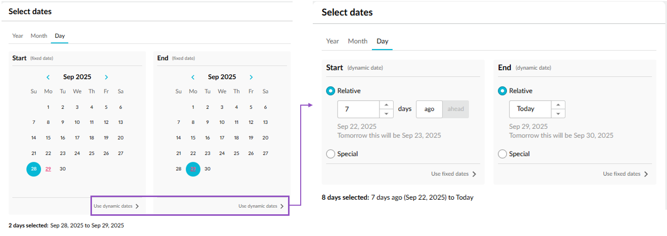 In addition to the relative options, the Day period type has special rules you can use to set dynamic start and/or end dates: