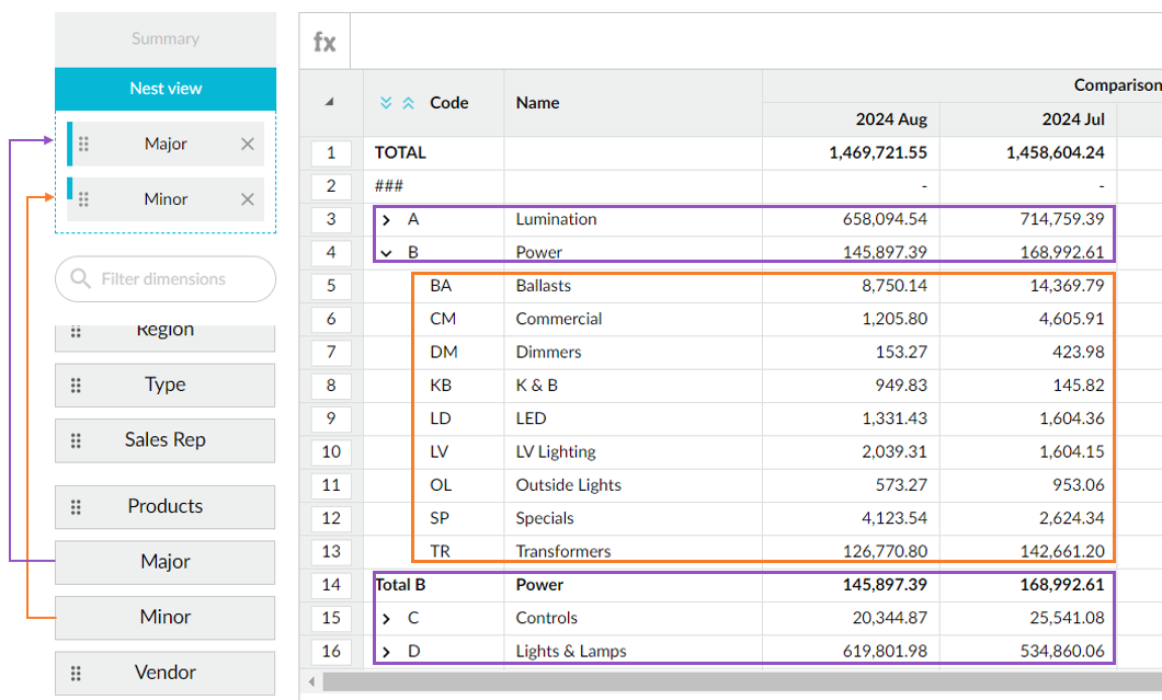 Use the Nest view feature in Flex Modes to add dimensions as levels in the grid. This alternative view makes the data easier to interpret, as you can review the contribution of different items within the overall results. It also allows you to create reports in which you define the hierarchy of the displayed data.