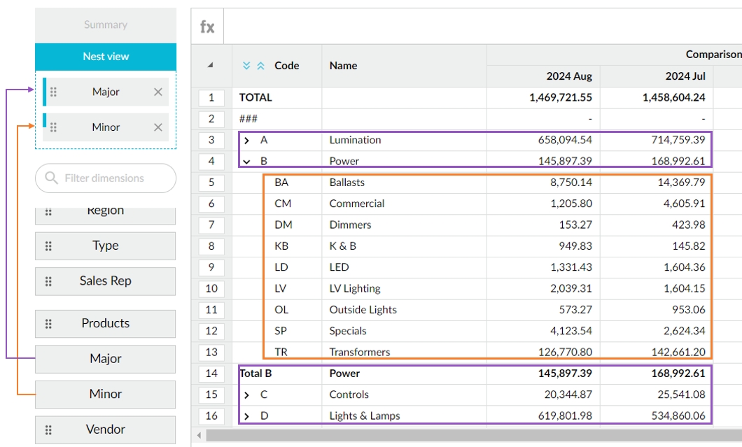 In the nest view, the data is initially displayed at the highest level and you can then expand that level to view the lower level of detail. In the Nest view box, a blue bar on a dimension indicates the data for that level is currently visible in the grid. So, for example, before you expand a level, you’ll only see the data in the top-level dimension. When you expand one row, a partial blue bar displays on the corresponding dimension, indicating that some of that data is visible in the grid, as illustrated in the image below.