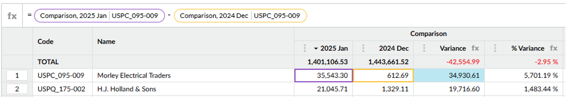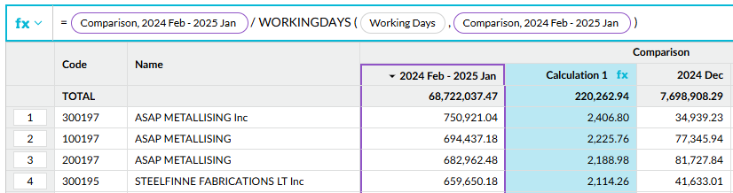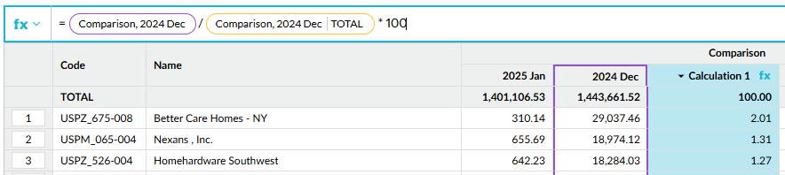 Right-click the first comparison column (Period 1) and click Add calculation column. The the fx bar turns into edit mode.