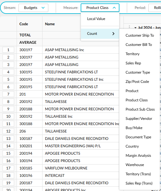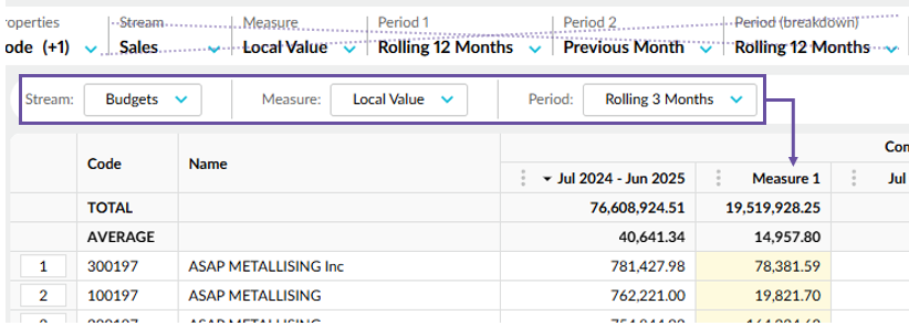 The measure column has its own definition, so it's independent of the Stream, Measure and Period menus in the toolbar, giving you a lot of flexibility when it comes to adding data to the grid.