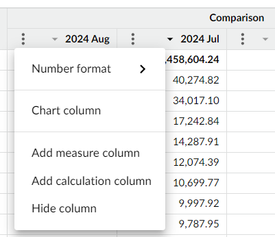 Right-click the column to the left of where you want to add the new column and click Add measure column. The column is added to the grid and the fx bar is transformed into the column definition menu.
