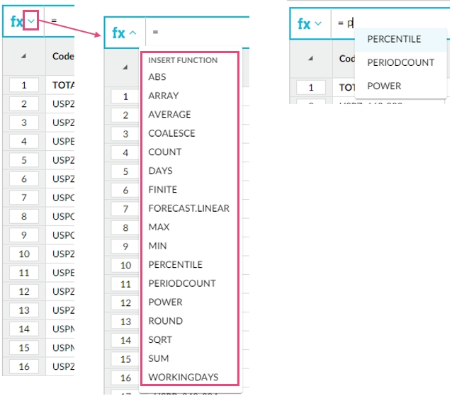 To use a function, either click the blue down arrow next to the formula box and select a function from the list, or start typing the name of the function you want to use. As you type, a list of function names displays based on what you've entered so far.