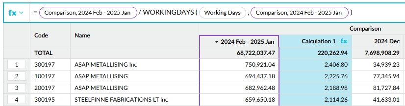 Take your analysis further by adding columns to perform custom calculations based on data within the grid. You can use basic arithmetic or write more complex formulas that reference other columns, or a cell in the summary row. You can also take advantage of the inbuilt functions to quickly create formulas for your calculation columns.