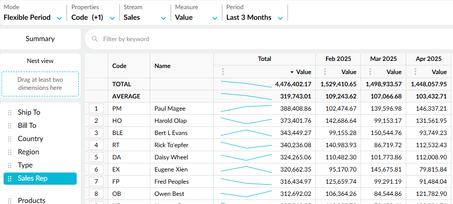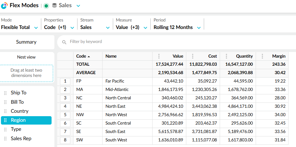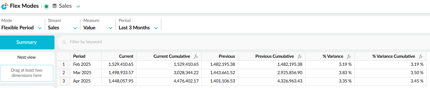 Flexible Total mode is the simplest view, removing all other columns except properties and the Total column. It’s particularly useful when multiple measures are selected, offering a clear, uncluttered summary of your data.