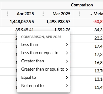 Right-click menu: A context menu that displays when you right-click a cell in a particular column. This is a handy way to do an advanced filter based on a condition directly from the grid.