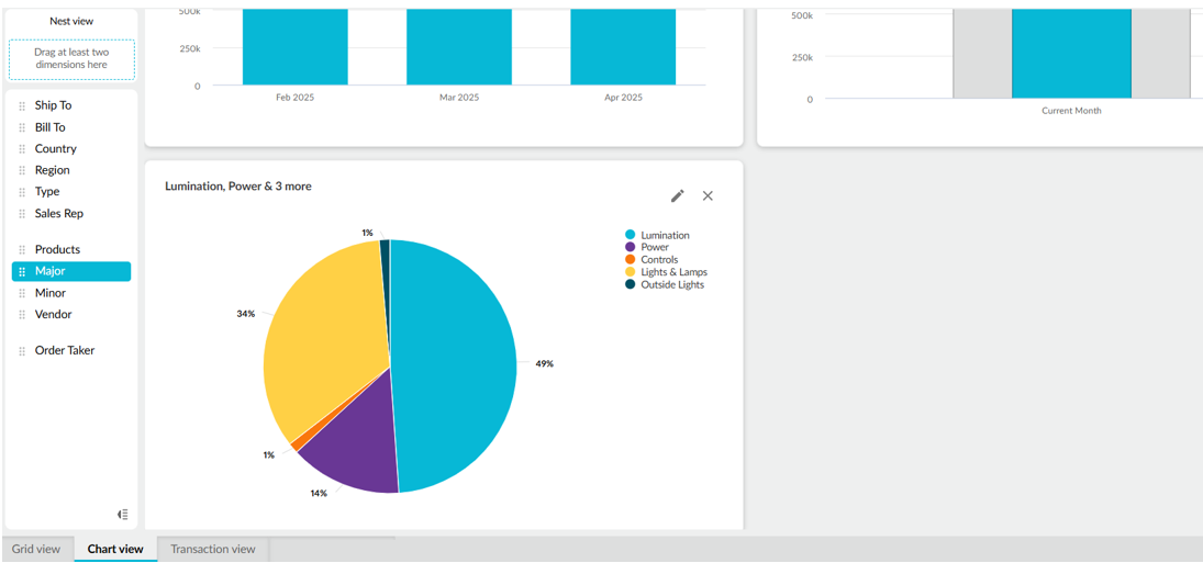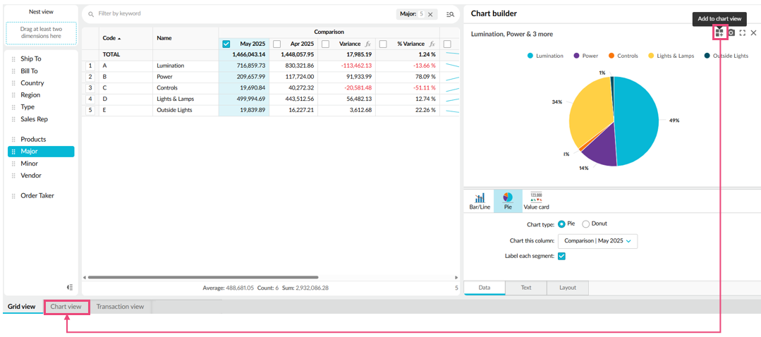 While the Chart view tab at the bottom of the grid contains some pre-built charts, you can create your own charts and add them to this tab. Charts are particularly useful when the grid has a lot of data; rather than scrolling through multiple columns or rows, you can get a visual overview of the data instead.