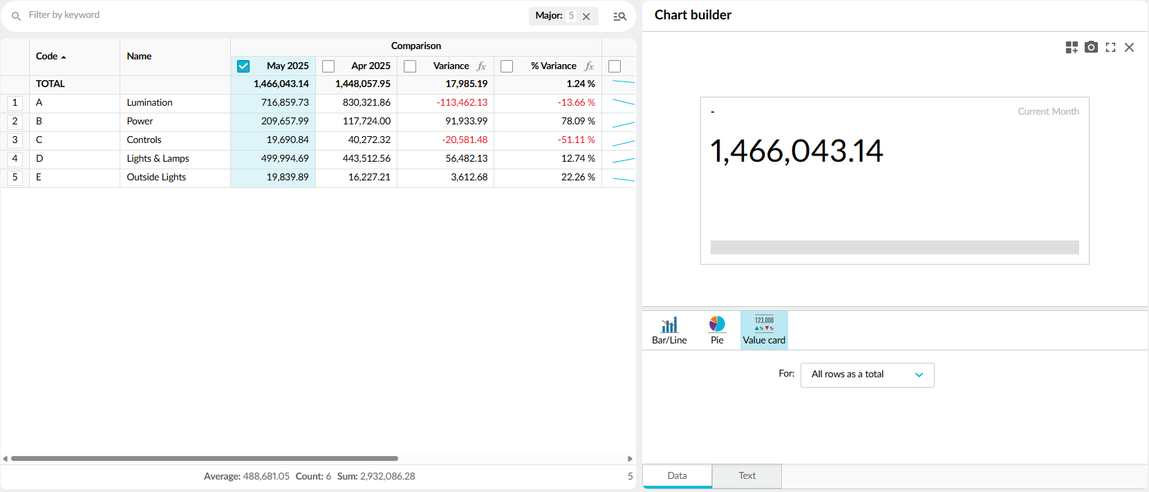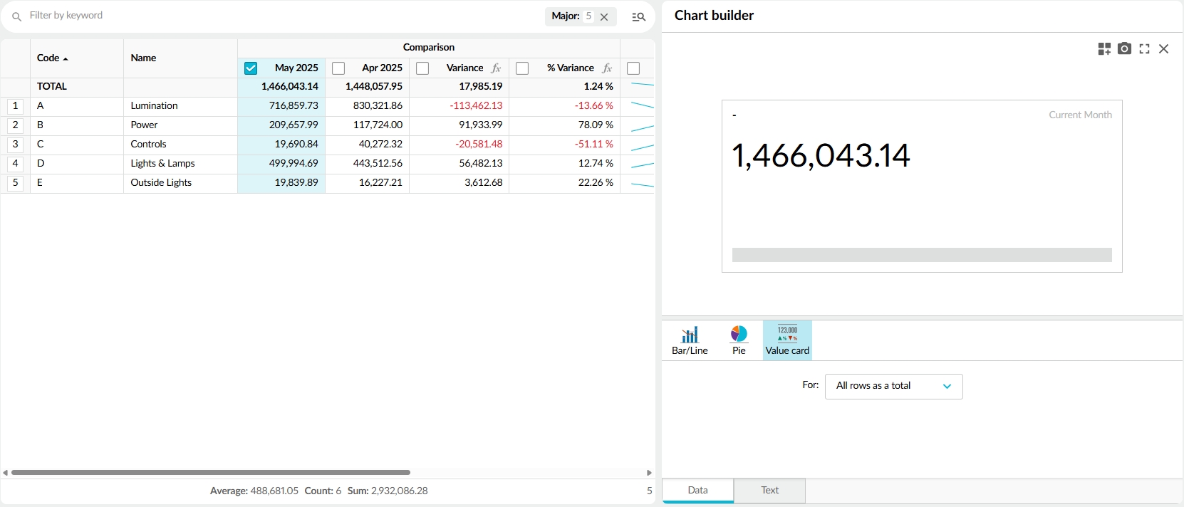 The chart builder tool in this mode is quite different from how you create charts in the other Analytics modes. It's more similar to the charting tool in the Financial Statements and Budgets & Forecasts module.