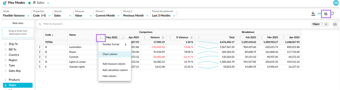 Use the menus in the toolbar to change your view of the data and watch the chart update accordingly. Your column selection is retained. For example, you might want to apply a different period or measure.