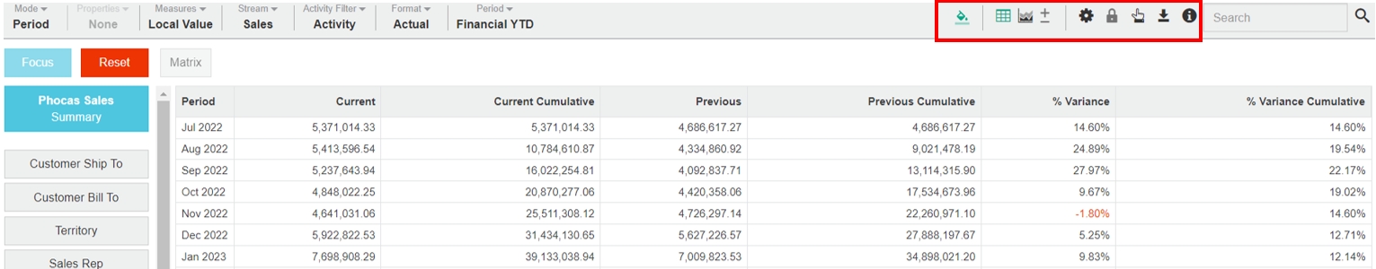 The toolbar on the right above the grid contains additional tools you can use to further customize your view of the data in the grid or chart. These options help you highlight key metrics, compare data across dimensions, and streamline your analytical workflow.