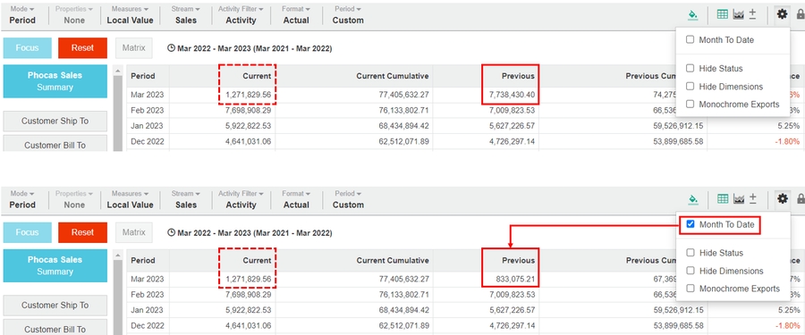 When selected, allows you to compare data for the current month to date (see below) with the corresponding number of days in a comparison (previous year) month.