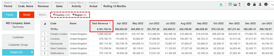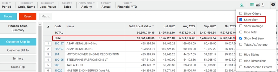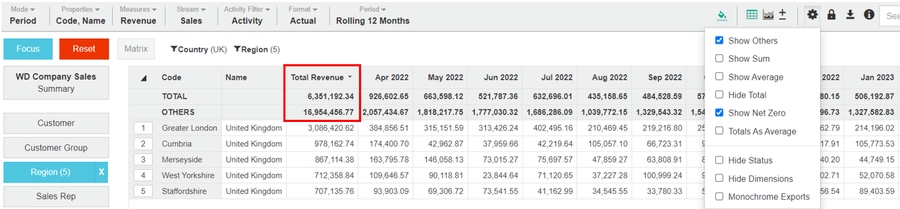 Available when a dimension is selected, adds a new row at the top of the grid (below the TOTAL row) that displays the total of the unfocused rows.