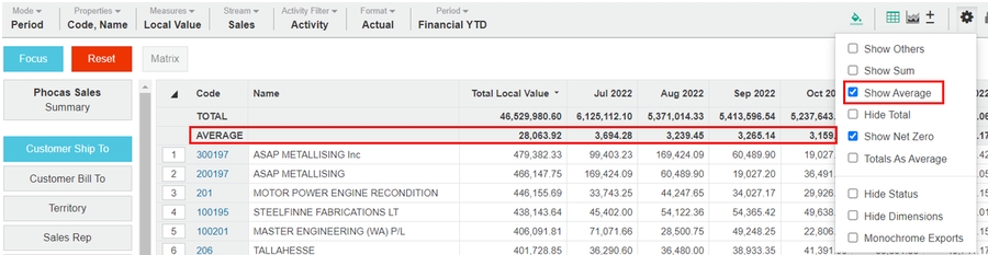 Available when a dimension is selected, adds a new row at the top of the grid (below the TOTAL row) to show the average of the data in each column.