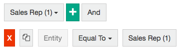 The Entity rule is based on a selected entity (or multiple entities) and it returns the same result as the action of selecting and focusing on data in the grid. The Entity rule is the most basic of the advanced search rules, as you are not entering information, just making selections. For example, Brand = ACME, or Rep = Harry and Daisy. Therefore, the search type options are restricted to Equal To and Not Equal To. Typically, you use an Entity rule to supplement other rules; you would not use it in isolation.
