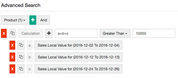 Then, to add up the sales on all the promotional days, enter the formula a+b+c into the Expression box.