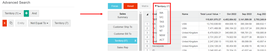 Example: View data for all territories, except for the seven territories in Australia:
