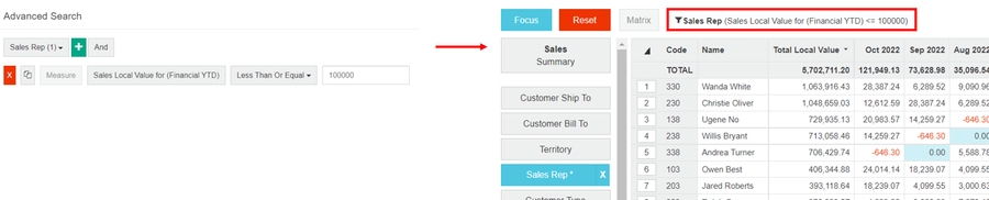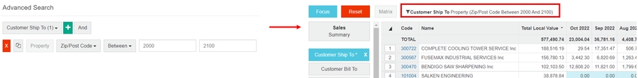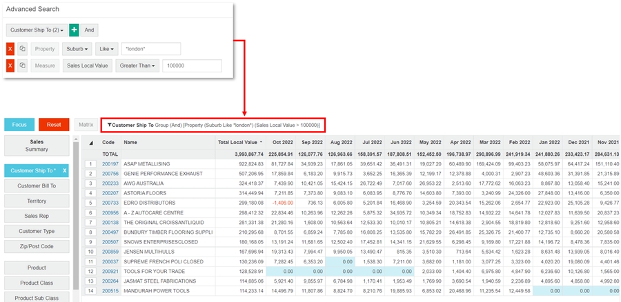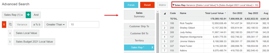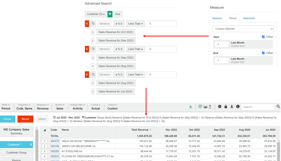 Whereas a basic search is suitable for quick, ad hoc analysis, an advanced search is typically used for creating a report or favorite. For example, you might want to identify customers whose sales have declined by more than 5% over the last 3 months.