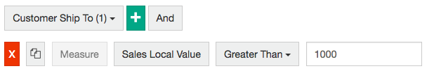 Set the measure to Stream = 'Sales' and Measure = 'Value' (see Define a measure) and Apply, then choose Greater than and enter '1000 'in the box. Note: Because we did not specify a period in this rule, the active period will apply.