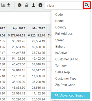 Note: Your grid settings may not match your advanced search settings. For this particular example, the results will be best viewed in the customer dimension, period mode, measures set to value, with periods set so that the year to date (months) are visible.
