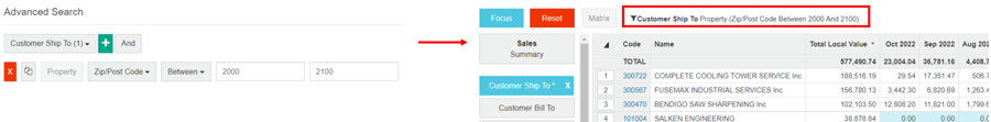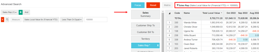 A common mistake is to assume that a measure-based advanced search is automatically filtered by selections made either before entering advanced search or subsequently. For example, using a measure rule to find all customers with a sales value greater than $1m will return all customers with sales over that value. If you then focus on another dimension, such as Product Group and display the customers, it is quite probable that the list will include rows where the sales value is less than $1m. This is because the selection of customers based on their total sales is acting independently of the filtered display. If you want to only see the customers with total sales greater than $1m for a specific Product Group, you need to edit the rule and add the selection via the Selections tab. See Define the measure to learn how to do this.