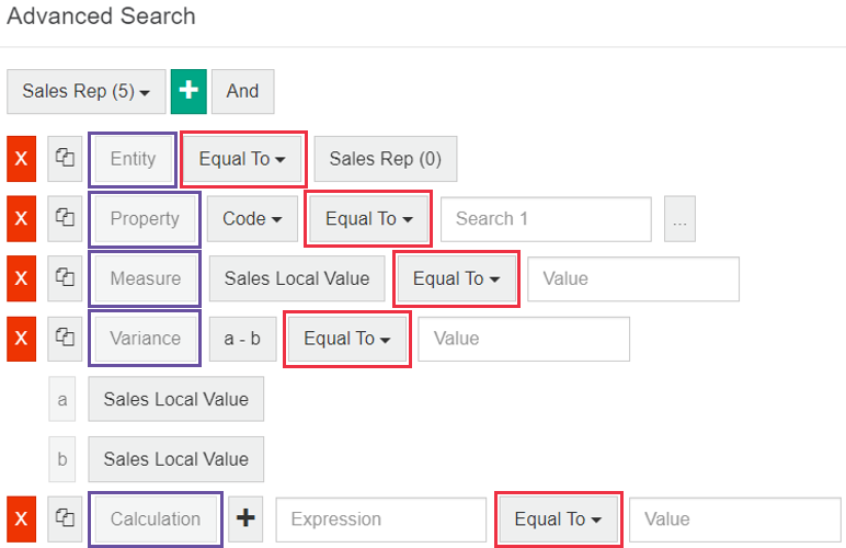 Rule type (purple boxes in the image below): There are five types of rules you can create for a selected entity: Entity, Property, Measure, Variance, and Calculation. You can use these rules individually or combine multiple rules for a more detailed search. There's detailed information on each rule type below.