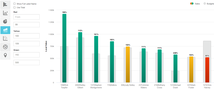Useful for tracking performance against a target, such as Sales Rep performance, as illustrated in the dashboard image below.
