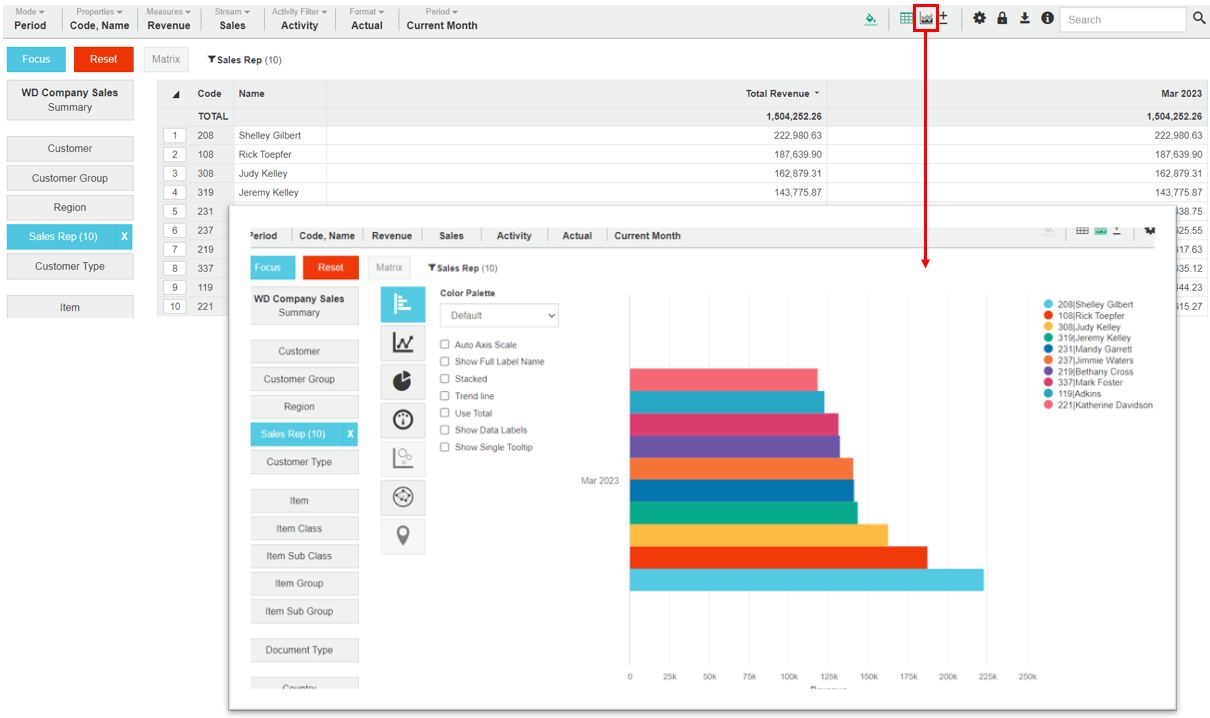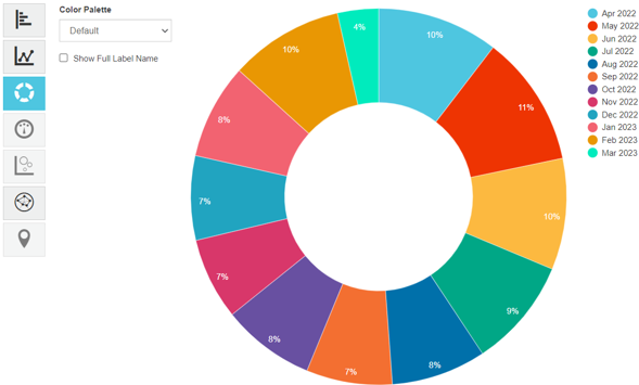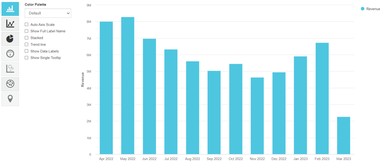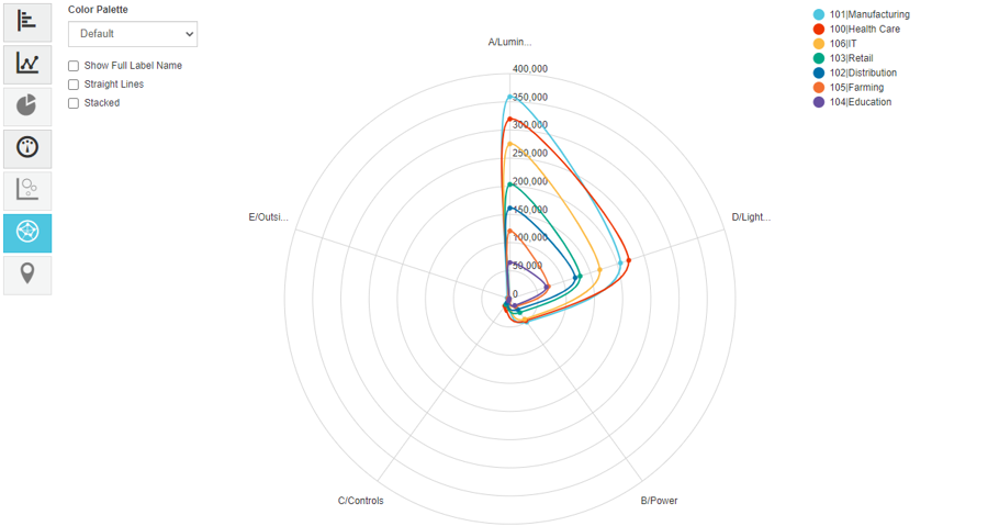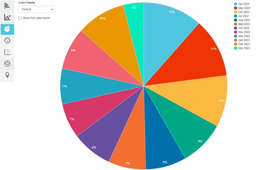 You can switch from the default grid view to the chart view any stage during your analysis. The same information is presented in chart view; it is just in a different format. Click the Chart button in the top right toolbar above the grid. A default chart displays, with chart category buttons on the left.