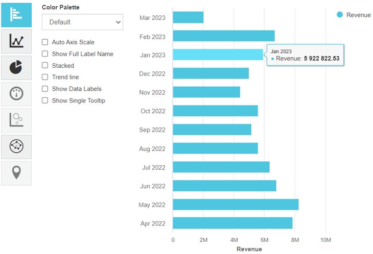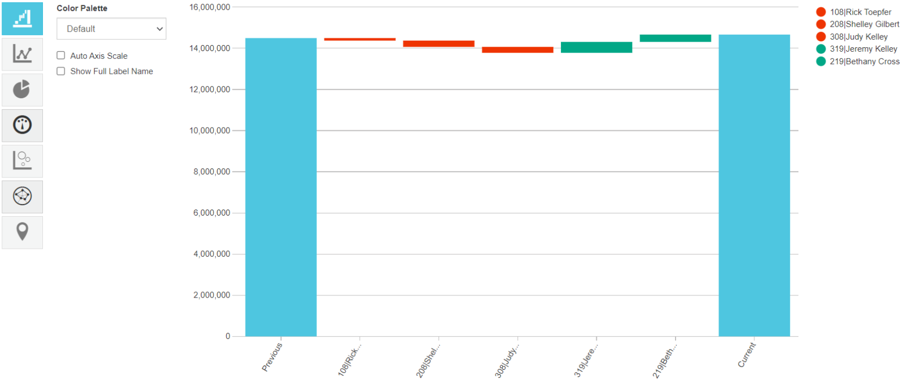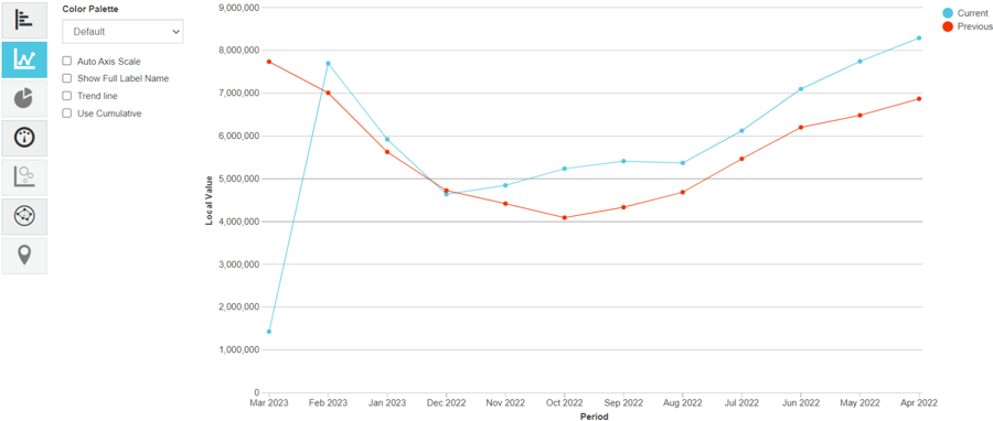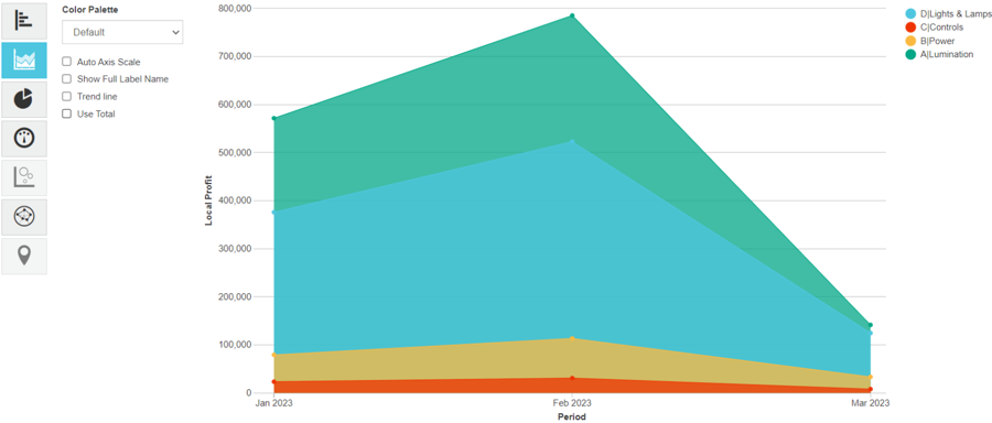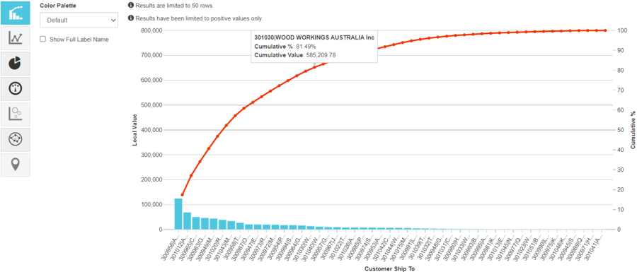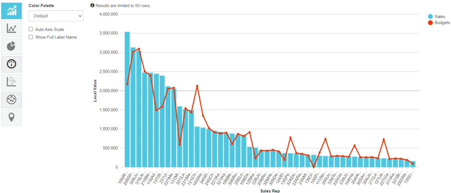 By default, only the first 50 rows of a grid are included in the chart. If you have a requirement for additional rows to be displayed, your Phocas consultant can assist with this. You can also display a sum instead of individual values (see Chart options).
