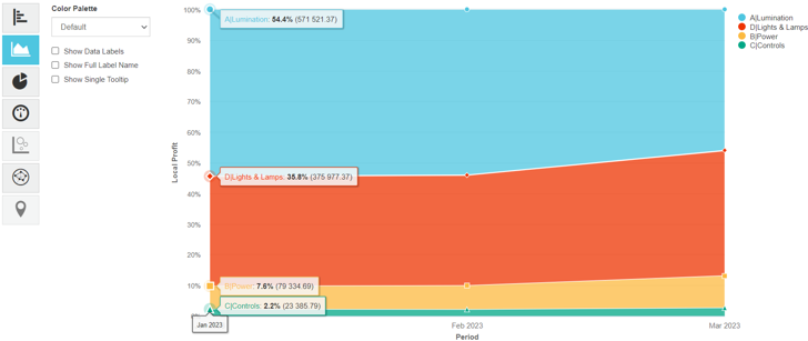 Same as the Area chart but the shaded areas are based on percentages rather than amounts.