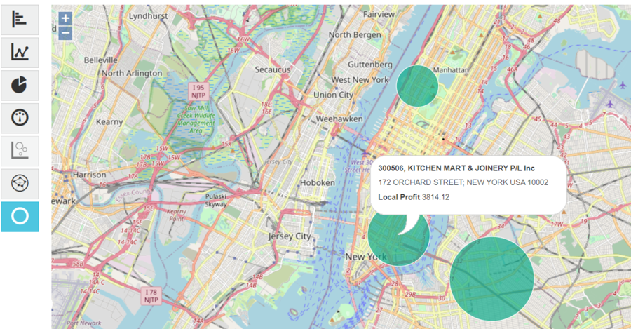 Displays a map with data points identified by a marker, circle or colored heat map.