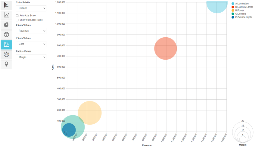 Displays color-coded circles (bubbles) plotted on an X and Y-axis to represent measures.