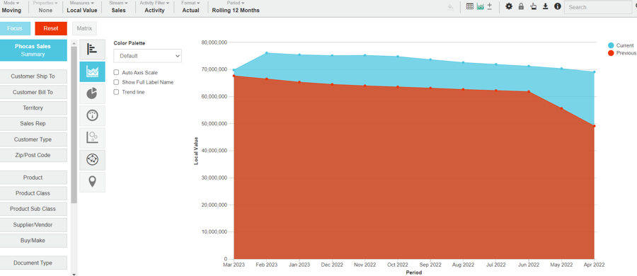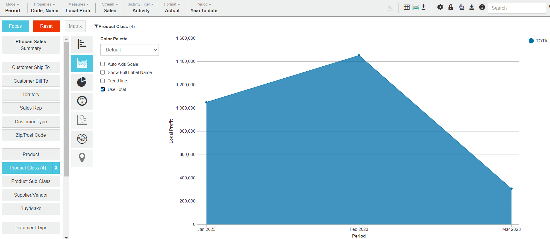Use Total: If you have a dimension selected and are in Period mode (as in the current example), you can select the Use total option to create a simplified Area chart. This option means that rather than charting all the focused items for each time unit, Phocas charts only the total. In the image below, the total value of the four product classes have been added together for each month, represented by a single blue shaded area.