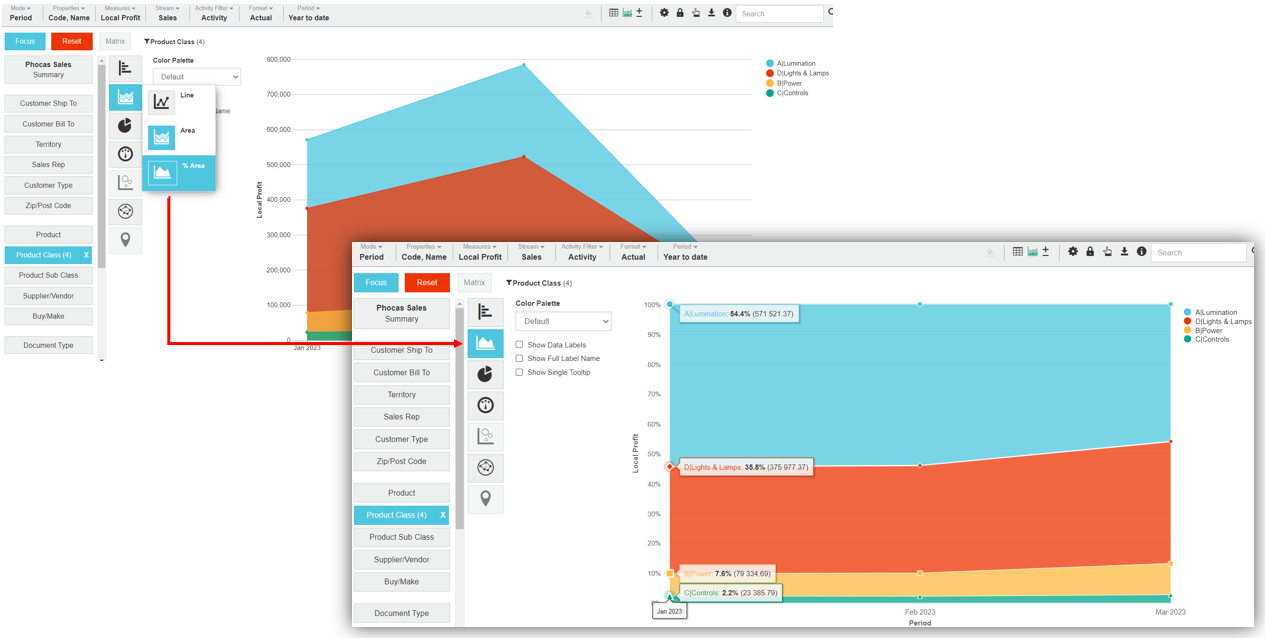 A % Area chart is very similar to an Area chart, however, the shaded areas are based on percentages rather than amounts (the Y-axis displays the percentage from 0 to 100% rather than the total amount). % Area charts provide a different way to view the proportional areas. They also have the benefit of tooltips showing the values in percentage form, which display when you hover over the data points.