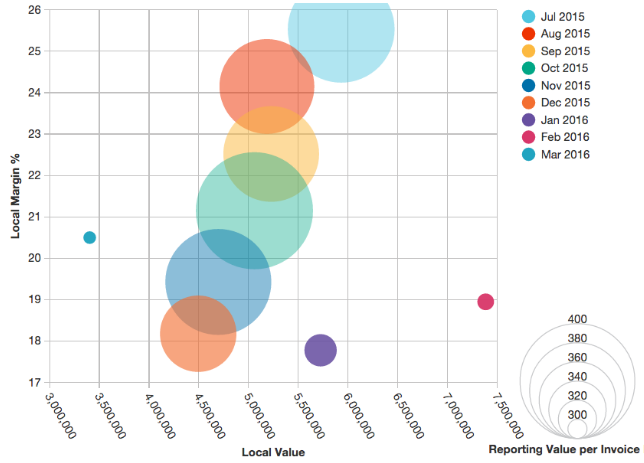 Using the Bubble chart in the above example, click the Summary button. The chart updates to display a bubble for each time unit within the selected period, which in this case is Financial YTD and each bubble displays the total performance of the selected product classes for each month so far.