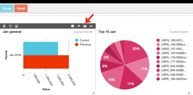 If the chart has been added as a widget on a dashboard, open the dashboard and hover over the widget to display its toolbar, then click the Export button (camera icon).