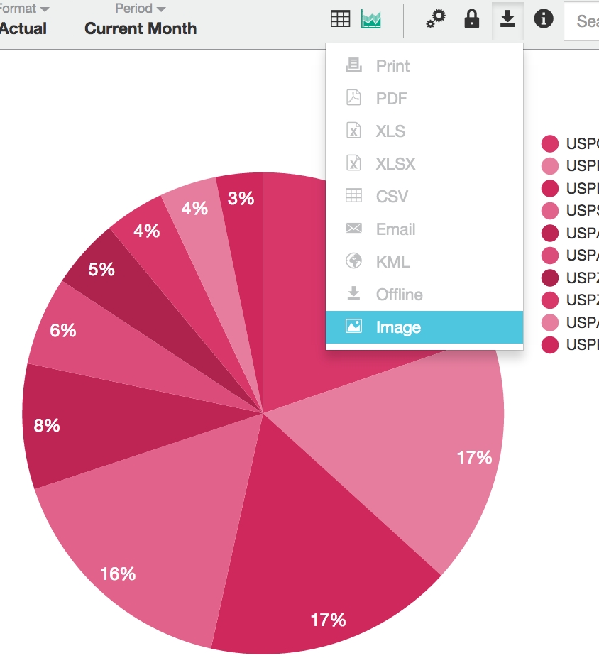 The easiest way to add a chart to a document or email is to download the chart as an image. You can do this from within Analytics or Dashboards.
